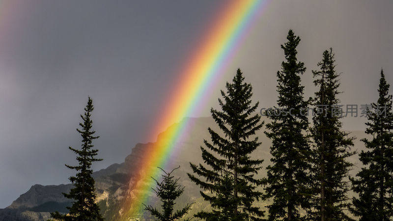 深色的针叶林剪影矗立于前景,一道鲜艳的彩虹从山谷升起,跨越远山,为暮色中的山野增添一抹奇幻色彩。