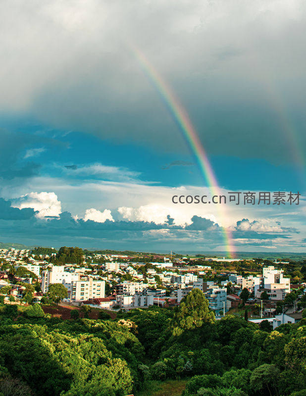 从高处俯瞰,城市楼宇与葱郁绿树相间,两道彩虹刺破厚重云层,为喧嚣都市带来片刻宁静与自然的馈赠。