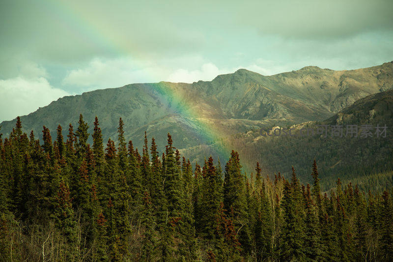 连绵起伏的群山之巅,一道彩虹如桥般横跨天际,山脚下苍翠的松林如绿色海洋,共同描绘出大自然的雄伟与壮丽。