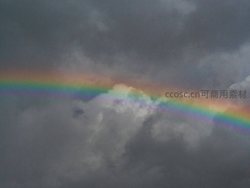 厚重的乌云被撕开一道缝隙,一道完整的彩虹从中显现,色彩斑斓,与灰暗的云层形成强烈对比,景象震撼人心。