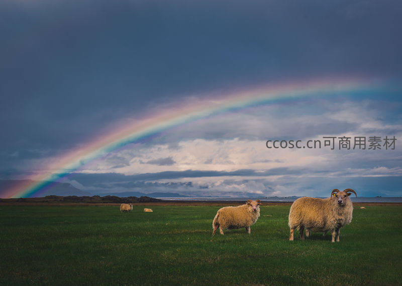 在辽阔的绿色草原上,几只绵羊悠然自得,背景是横跨天际的绚丽彩虹和厚重云层,构成一幅宁静祥和的自然画卷。
