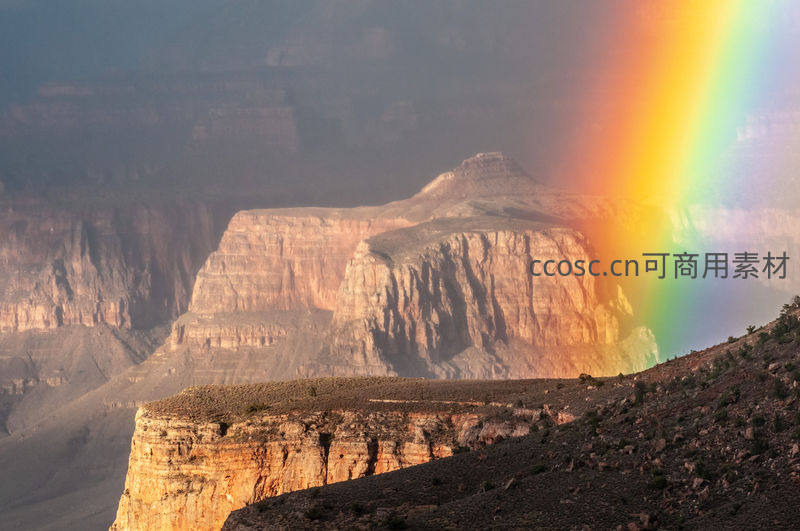宏伟的峡谷岩壁在夕阳下泛着金光,一道垂直的彩虹从天而降,仿佛光柱般照亮崎岖山体,展现大自然鬼斧神工的震撼之美。