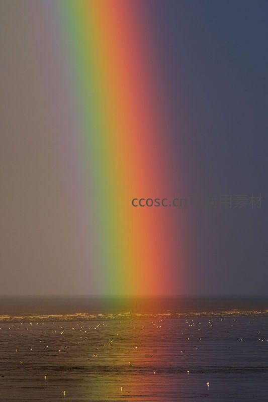 一道垂直的彩虹从天际垂落至平静海面,水波荡漾反射七彩光芒,远处地平线朦胧,营造出浪漫、静谧且充满魔幻色彩的海滨黄昏景象。