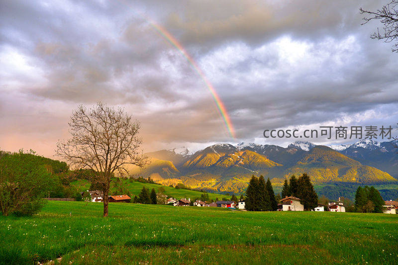一道完整的彩虹横跨在绿意盎然的山谷与村庄之上,远处雪山与晚霞相映,构成一幅宁静祥和的田园画卷。