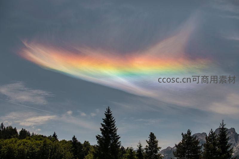 天空中一片独特的云层呈现出彩虹般的色彩,下方是静谧的森林与山峦,仿佛大自然绘制的奇幻画作。