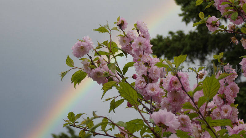 前景是盛开的粉嫩樱花,背景中一道朦胧的彩虹若隐若现,共同营造出春日里温柔浪漫的诗意景象。