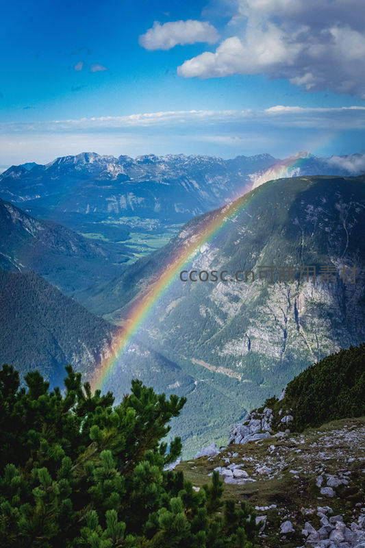 站在高山之巅,视野开阔,一道彩虹如桥梁般跨越幽深峡谷,连接着苍翠山峦与远方云海,气势恢宏。