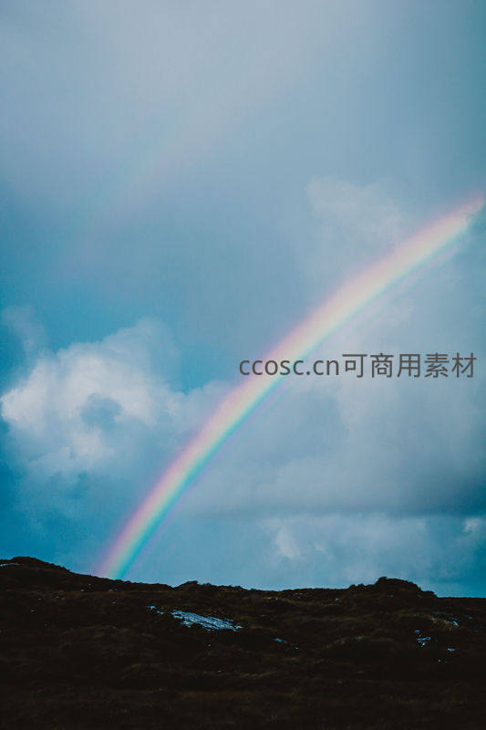 辽阔高原上,一道彩虹从厚重云层中斜射而出,下方是深色的草甸和零星积雪,充满诗意与宁静。