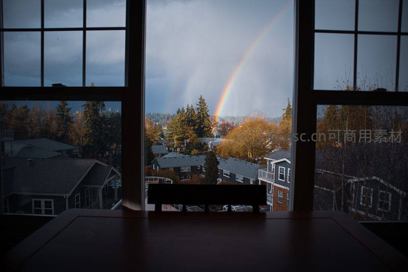 从室内窗框向外望去,雨后的社区上空悬挂着一道清晰的彩虹,为平凡的日常家居生活增添了一抹惊喜与诗意。