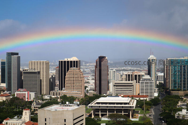 城市上空的彩虹横跨天际,现代建筑群沐浴在七彩光辉中
