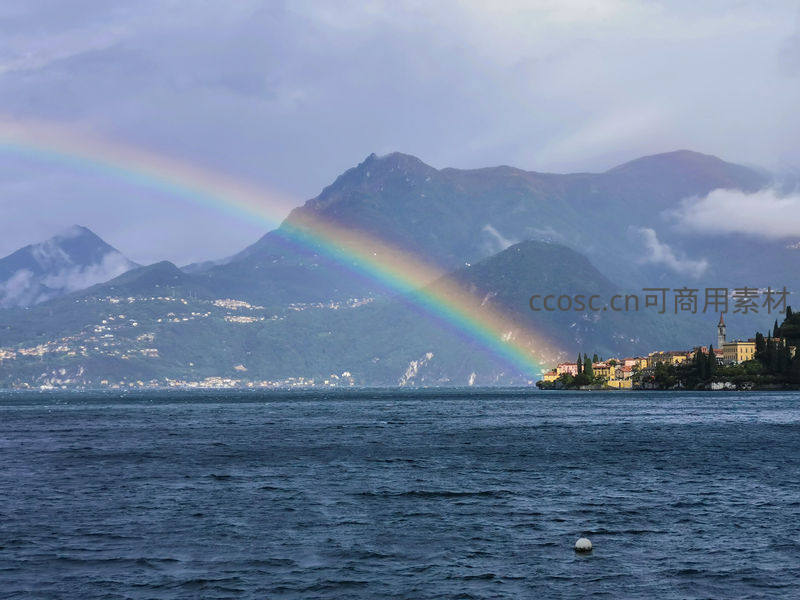 一道彩虹温柔地连接着湖对岸的青山与湖畔小镇,波光粼粼的水面倒映着七彩光芒,营造出如诗如画的欧洲风情。