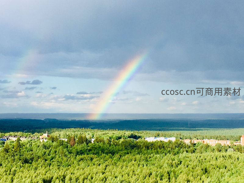 从高空俯瞰,一片无垠的绿色森林上方,一道清晰的主彩虹与微弱的副虹同时出现,共同演绎着大自然的鬼斧神工。