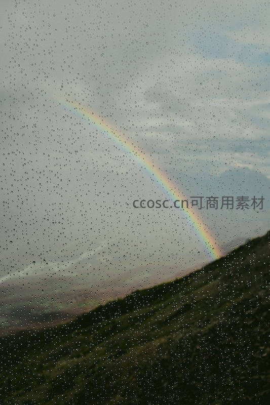 雨滴覆盖玻璃,窗外彩虹若隐若现如梦境