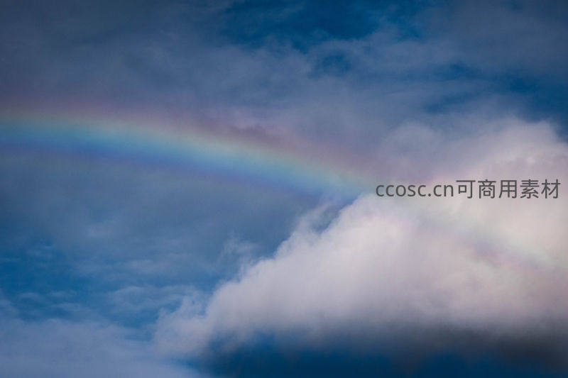 轻柔白云飘浮于湛蓝天空,彩虹悄然穿行其间,营造出宁静空灵、充满诗意的画面。