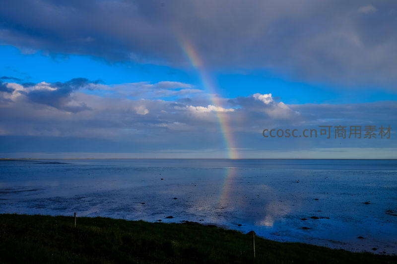 海岸线上彩虹倒映水面,天地一色如画卷