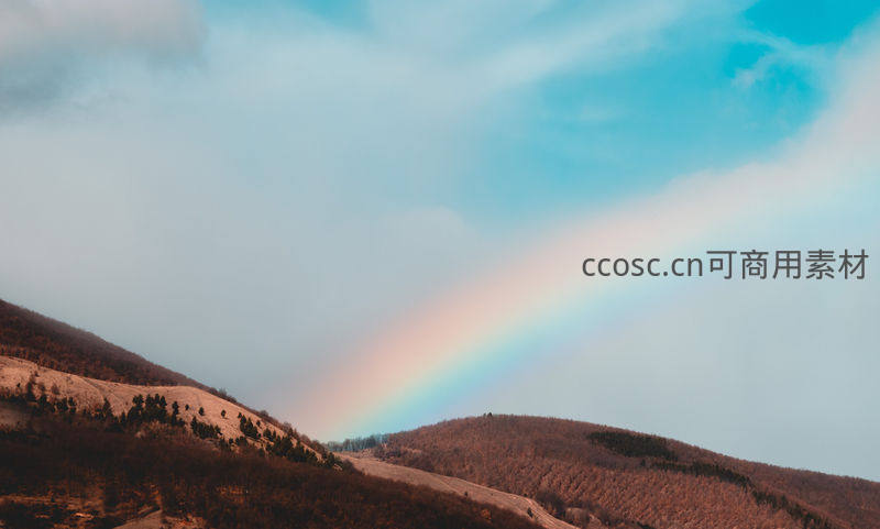 柔和的彩虹轻搭在连绵的山脊之上,山体覆盖着枯黄的植被,天空湛蓝,呈现出一幅宁静祥和的山野图景。