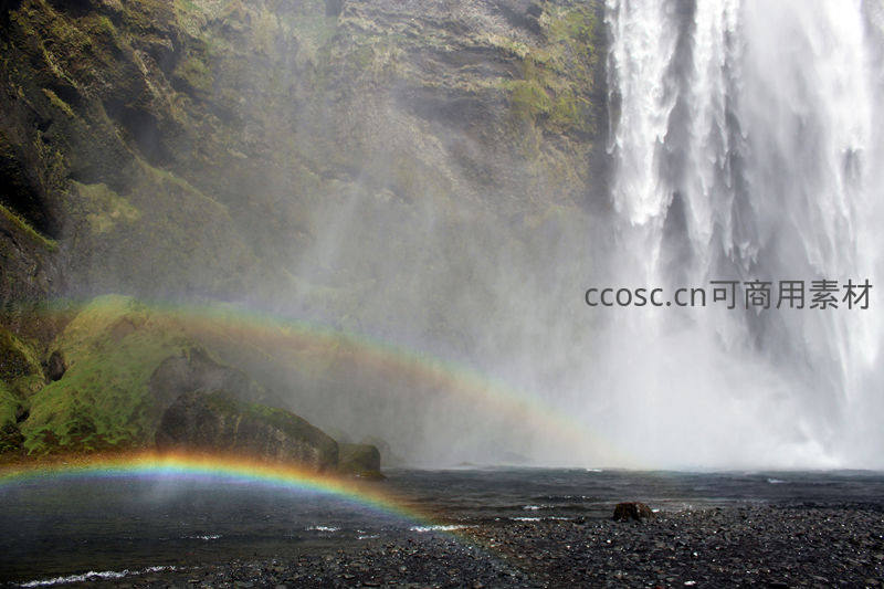 壮观的瀑布从高崖倾泻而下,水雾弥漫中一道绚丽彩虹横跨水面,景色如梦如幻。