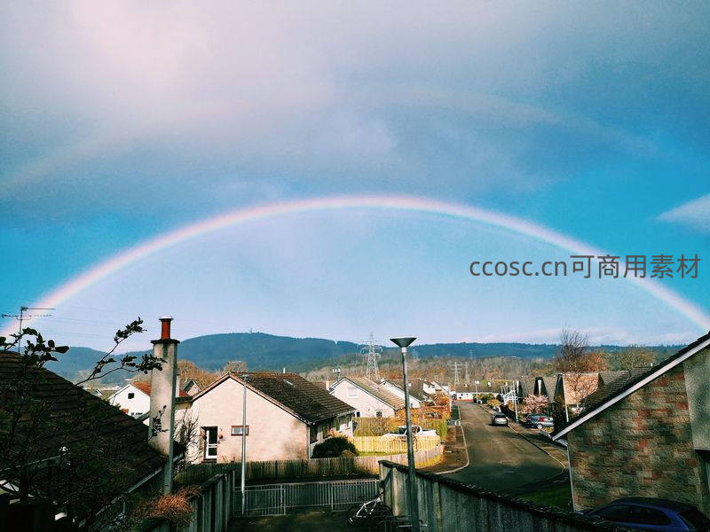 一道完整的彩虹优雅地悬挂在居民区上空,将平凡的街景点缀得如童话般梦幻与宁静。