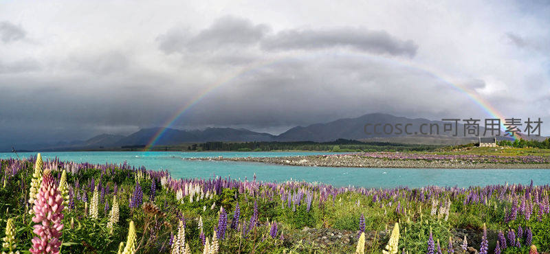 湛蓝湖水边盛开着缤纷的鲁冰花,远处山峦之上一道彩虹跨越天际,构成绝美画卷。