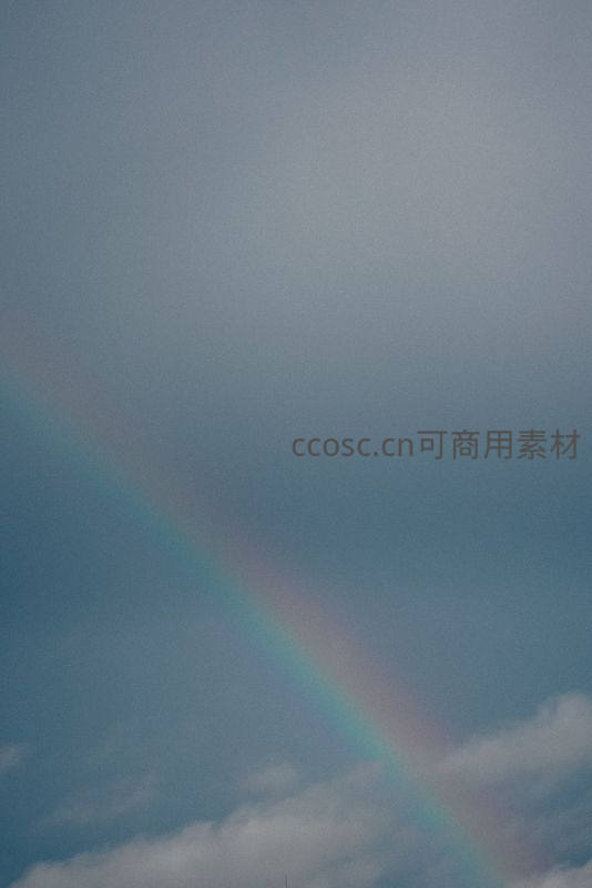 灰蓝色的厚重云层间,一道微弱却清晰的彩虹若隐若现,营造出宁静而神秘的视觉感受。