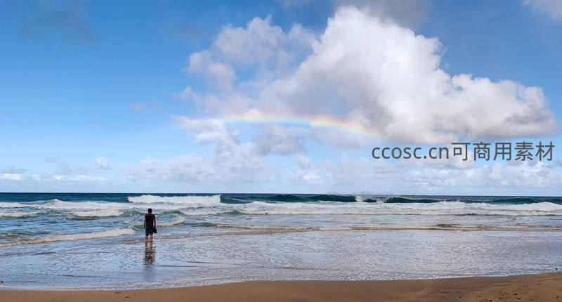 一人赤足立于沙滩浅水处,仰望天边横跨云朵的彩虹,海风轻拂,浪花温柔拍打,尽享假日宁静时光。