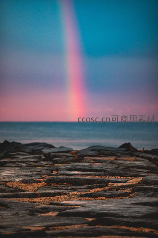 夕阳西下,一道垂直的彩虹从海平线升起,岩石滩涂在柔和光线下泛着金黄,营造出静谧唯美的画面。