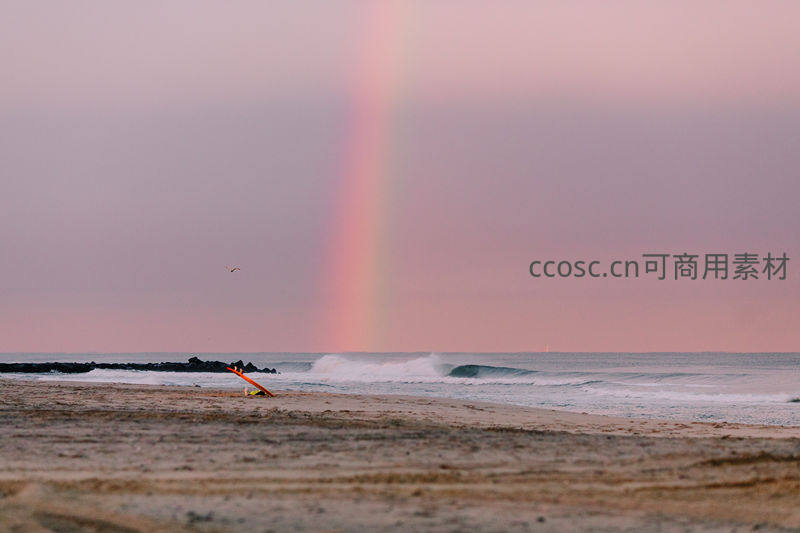 夕阳西下,一道绚丽彩虹横跨天际,沙滩上孤零零的冲浪板静卧,海浪轻拍岸边,氛围宁静而梦幻。