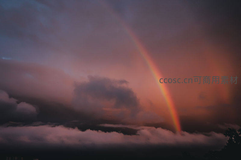 黄昏时分,厚重云层被染成紫红色,一道主彩虹与隐约副虹交相辉映,为苍穹披上绚烂而温柔的外衣。