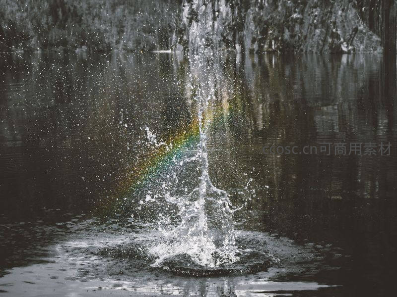 一滴水击打湖面,激起晶莹水花,在阳光照射下折射出细小彩虹,定格了自然魔法般转瞬即逝的美丽时刻。