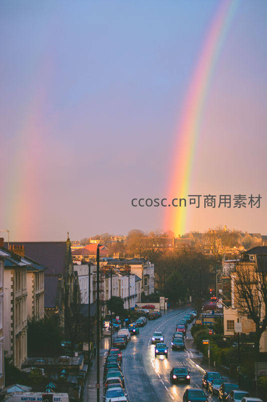 夕阳西下,城市街道上空出现壮观的双彩虹,车辆穿梭于光影之间,现代建筑与自然奇观交融,呈现出都市生活中难得一见的梦幻时刻。