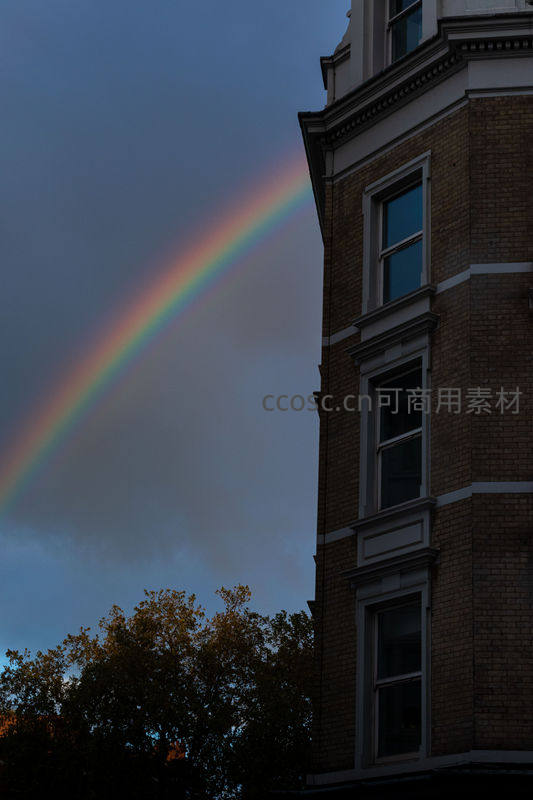 一弯彩虹悄然出现在城市老式砖楼旁,深蓝天空与暖黄窗框形成对比,树木剪影衬托出都市中难得的自然奇观与宁静氛围。
