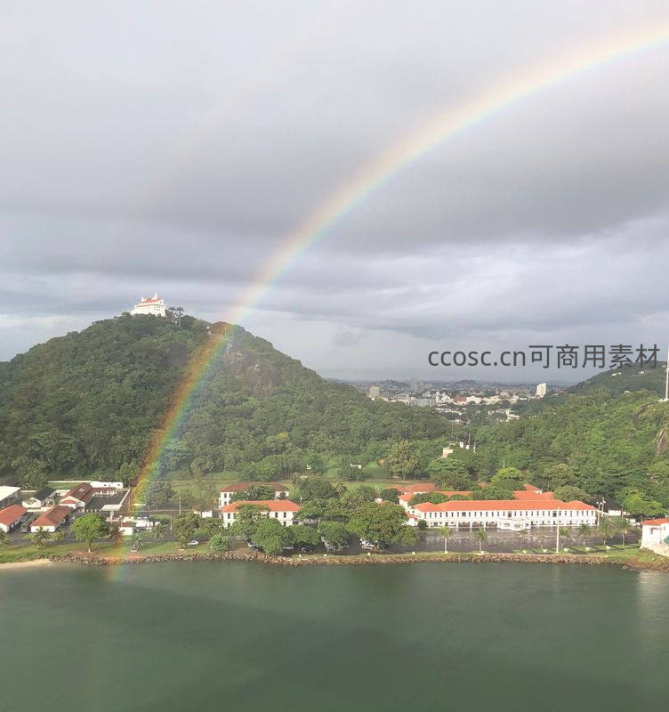 从高空俯瞰,一道完整彩虹跨越碧绿海湾与郁郁葱葱的小山,山顶白色建筑与沿岸红顶房屋错落有致,宛如童话中的海滨胜地。