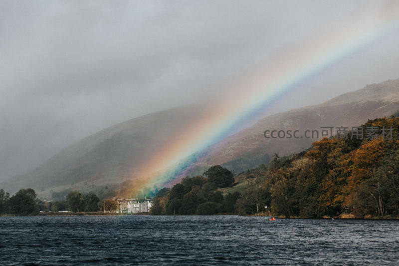 湖畔山间彩虹斜挂,秋林斑斓倒影生辉