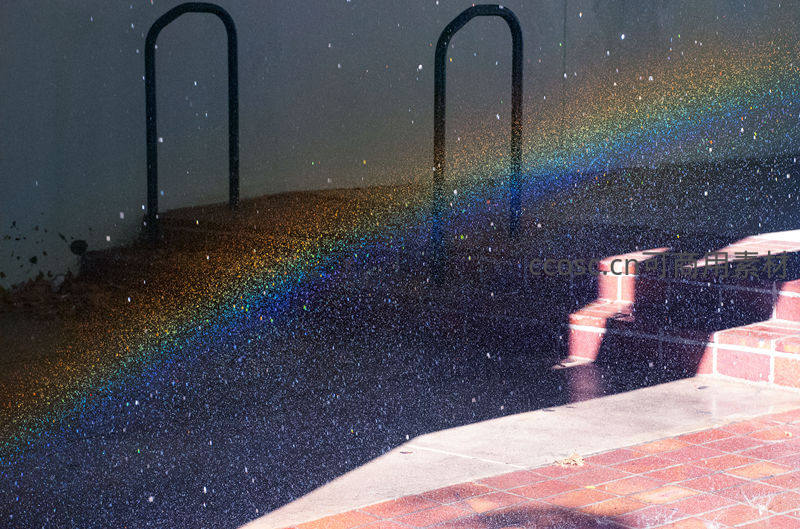 泳池边水花四溅,在灯光下折射出梦幻般的彩虹光带,砖砌台阶与黑色扶手构成静谧的夜间场景。