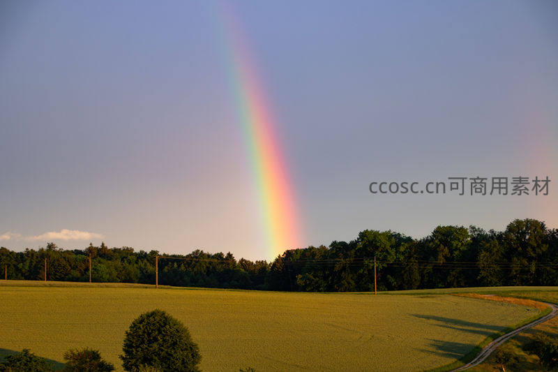 金色麦田延伸至远方,一道完整的彩虹从林间升起,夕阳余晖洒满大地,营造出宁静祥和的田园画卷。