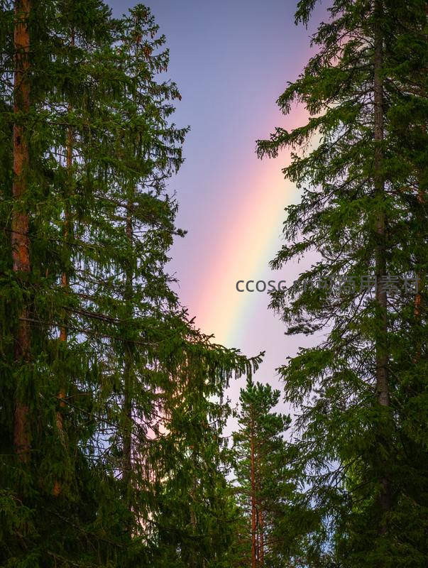 高耸的松树林间,一道柔和的彩虹自树梢缝隙中显现,淡紫色天空与翠绿针叶形成鲜明对比,意境清幽。