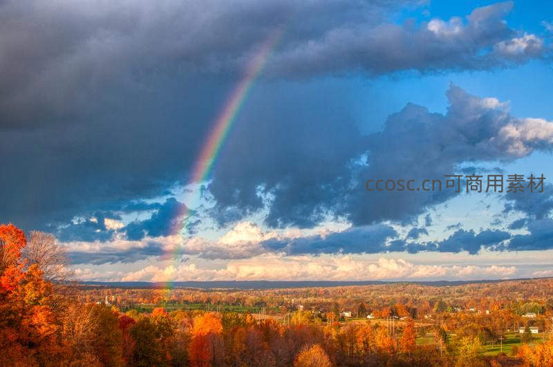 秋日山谷层林尽染,浓云翻滚间一道彩虹贯穿天际,金黄与火红的树叶铺满大地,充满诗意与生机。