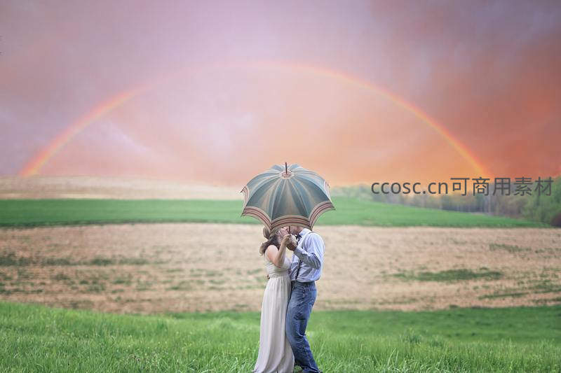 田园情侣伞下吻,彩虹为证爱永恒