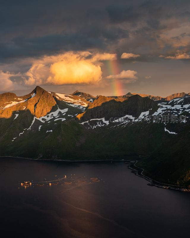 夕阳余晖穿透云层,在雪山与峡湾之间勾勒出一道彩虹,水面倒映着村庄灯火,景色恢弘瑰丽。