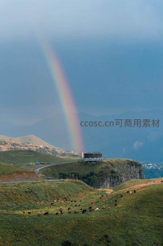 一道斜向彩虹划过青翠高原,牛羊散落坡上悠然吃草,蜿蜒公路与孤楼点缀其间,尽显生态之美。