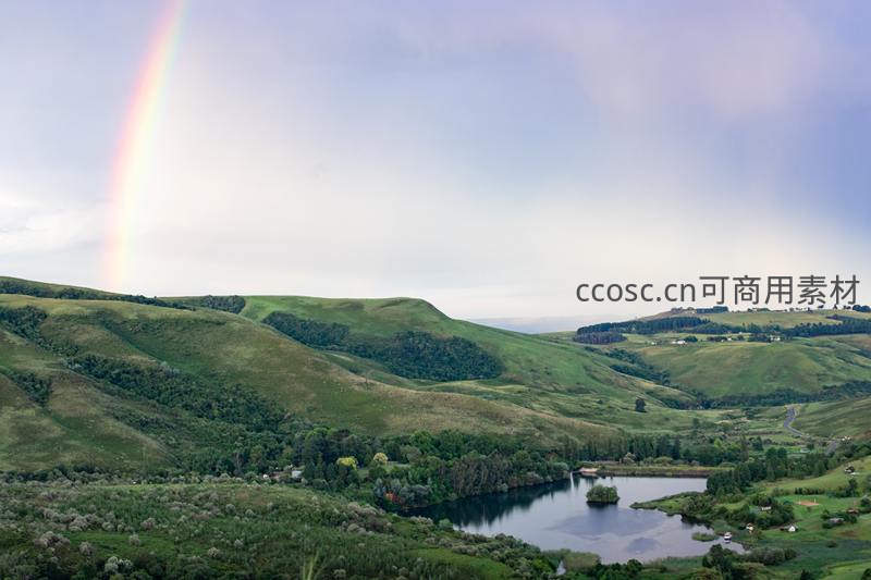 一道绚丽的彩虹高悬于连绵起伏的绿色山丘之上,山脚下是平静的湖泊和零星村落,构成一幅宁静壮丽的自然画卷。