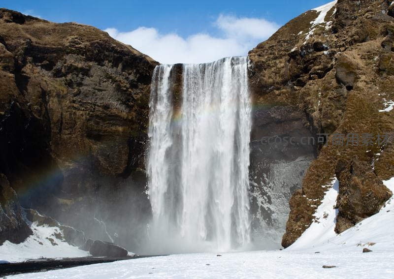雄伟的瀑布从陡峭的岩壁倾泻而下,水雾中清晰可见一道主彩虹和一道副彩虹,周围覆盖着白雪,景色震撼人心。