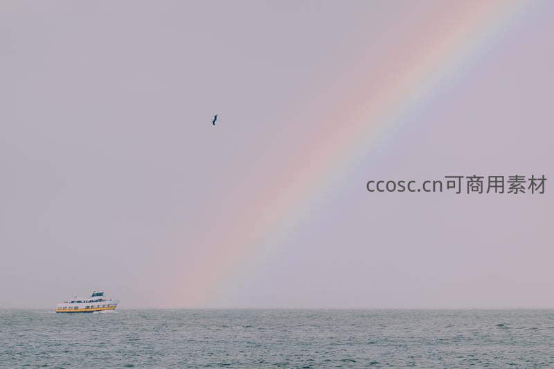 一艘小船和一只飞鸟点缀在无垠的海平面上,一道柔和的彩虹斜挂天际,整个画面空旷、宁静,充满诗意与遐想。