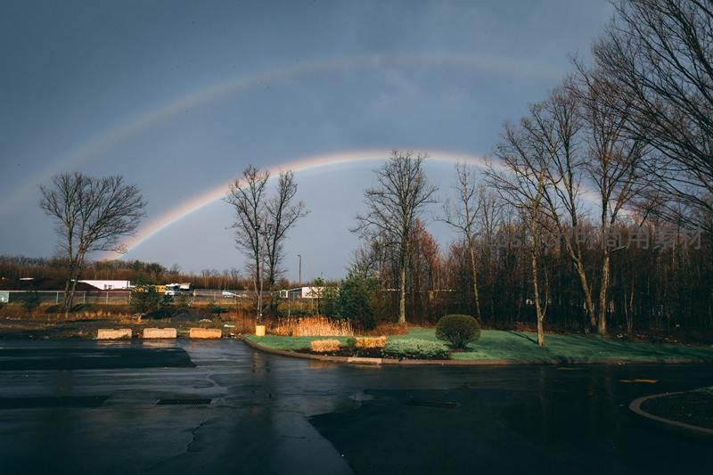 一场阵雨过后,湿润的公园里,一道完整的双彩虹优雅地悬挂在天际,光秃的树枝与青翠的草坪形成对比,画面宁静而治愈。