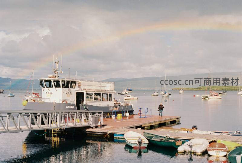 宁静的港湾内停泊着大小船只,一道完整的彩虹高悬于远山与云层之上,倒映在平静水面,营造出如画般的度假氛围。