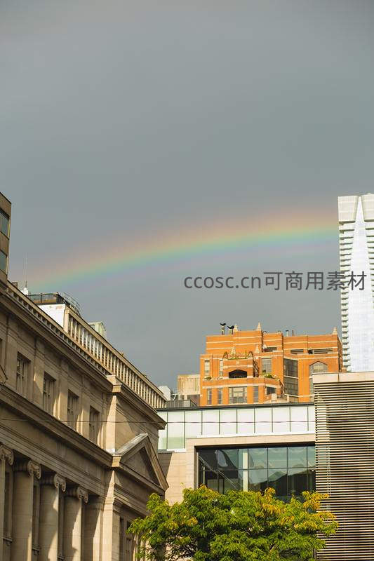 在古典与现代建筑群的缝隙中,一道完整的彩虹如拱桥般横跨天际,为灰暗的城市天空增添了一抹梦幻色彩。
