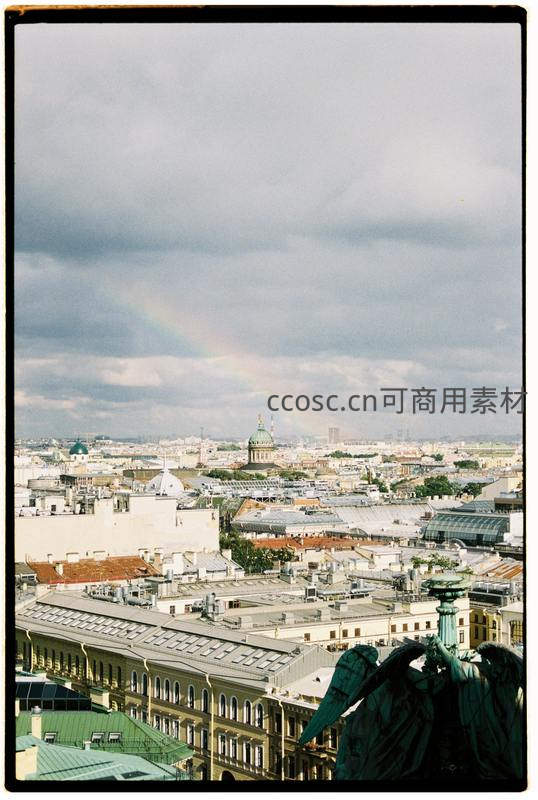 从高处俯瞰城市全景,彩虹悄然划过云层,连接古老穹顶与现代街巷,展现历史与自然交融之美。