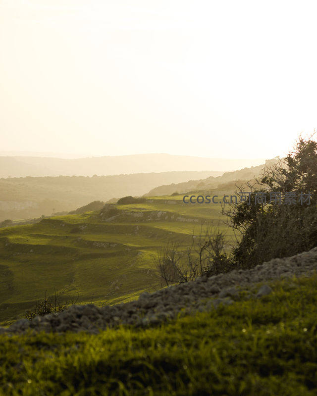 温暖的夕阳光芒洒在连绵起伏的绿色丘陵上,光影柔和,营造出一片宁静祥和、充满诗意的田园风光。