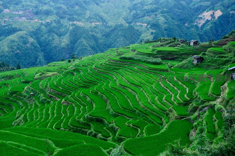 连绵起伏的青山环抱着一片片如绿绸缎般柔顺的梯田,远处村落若隐若现,构成一幅宁静而壮丽的山水田园风光图。
