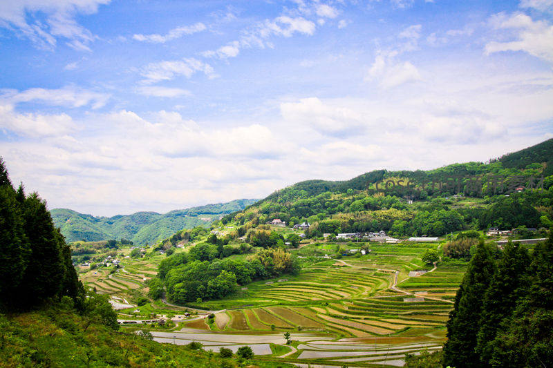 在青翠山峦的怀抱中,水田如镜面般反射着蓝天白云,构成一幅静谧而诗意的田园风光画卷。